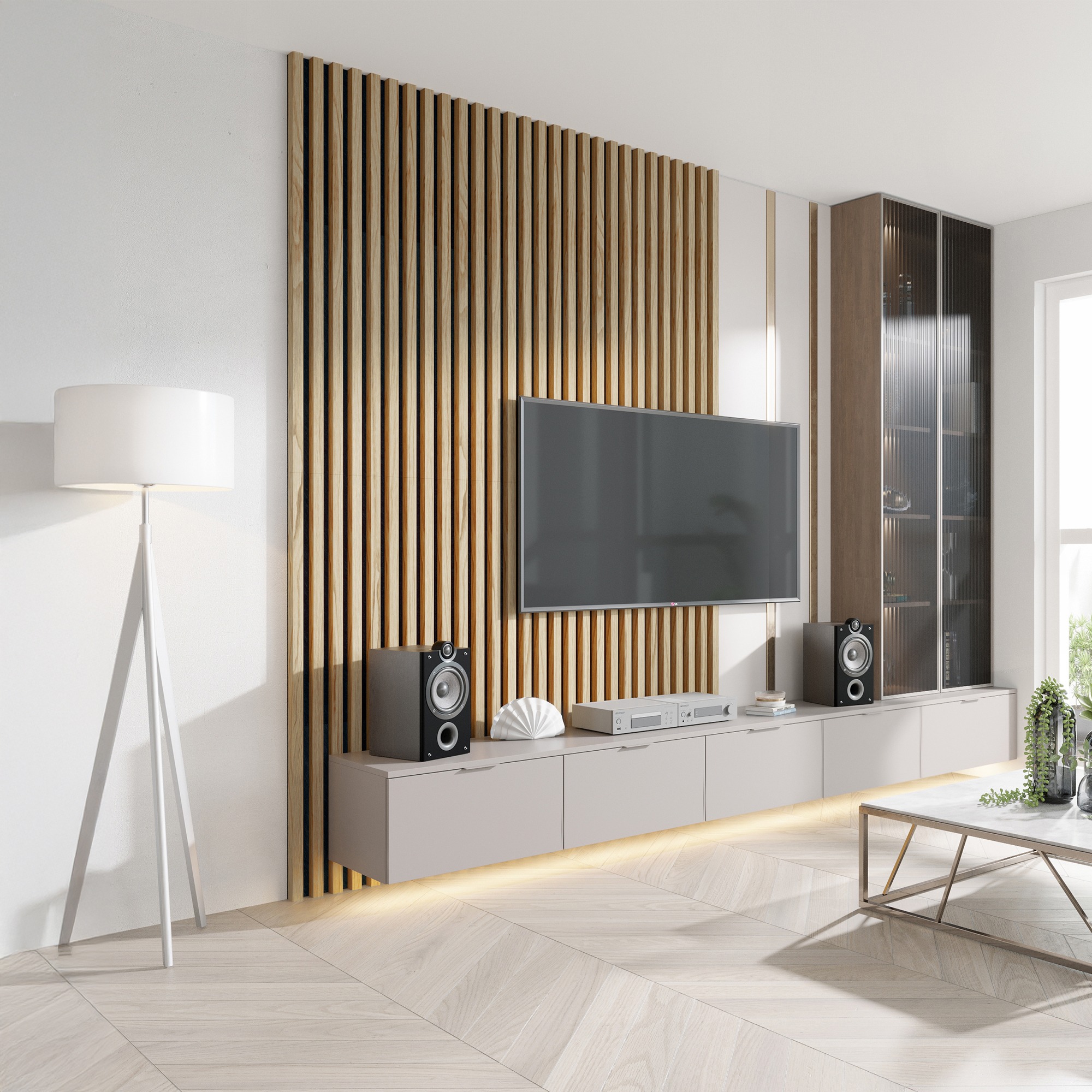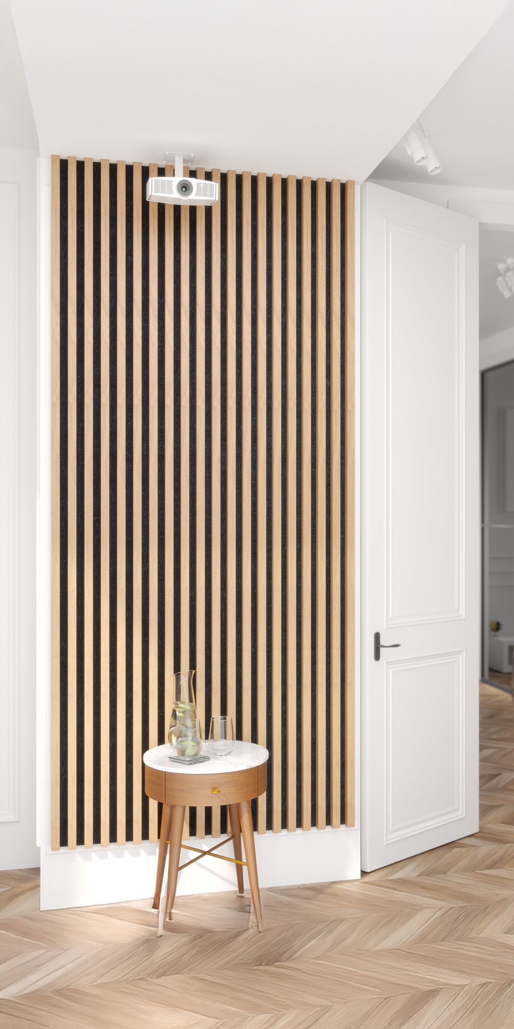 Las lamas acústicas de pared AkuWall son una línea de paneles acústicos de diseño disponible en dos versiones: las clásicas lamas de chapa de roble natural sobre fieltro y las modernas lamas totalmente hechas de fieltro, denominadas AkuWall Felt. Ambas opciones utilizan fieltro acústico reciclado de alta calidad de 12 mm, que absorbe eficazmente el sonido y elimina el eco no deseado, creando un impresionante efecto tridimensional en la pared o el techo. Las lamas de madera aportan un carácter cálido y natural, mientras que la versión de fieltro ofrece un diseño minimalista y contemporáneo. Disponibles en una amplia gama de colores – desde tonos naturales de madera hasta colores intensos de fieltro – se integran perfectamente en todo tipo de decoraciones interiores. Son ideales para salas de conferencias, oficinas, hoteles, estudios de grabación y espacios domésticos donde se desea mejorar la acústica sin renunciar al diseño.