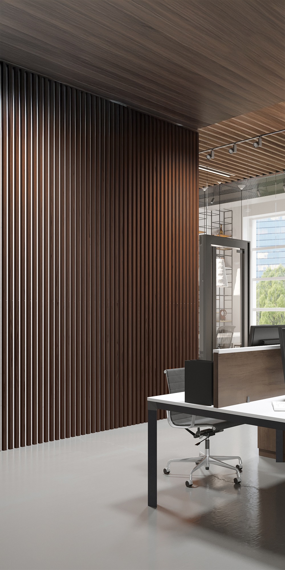 Los paneles están hechos de chapa de roble natural y fieltro reciclado. Mejoran la acústica del espacio y son decorativos. Se colocan en paredes o techos. Cada lama está dispuesta verticalmente sobre una base de fieltro de 12 mm. Disponibles en colores como roble natural, grafito o marrón oscuro.