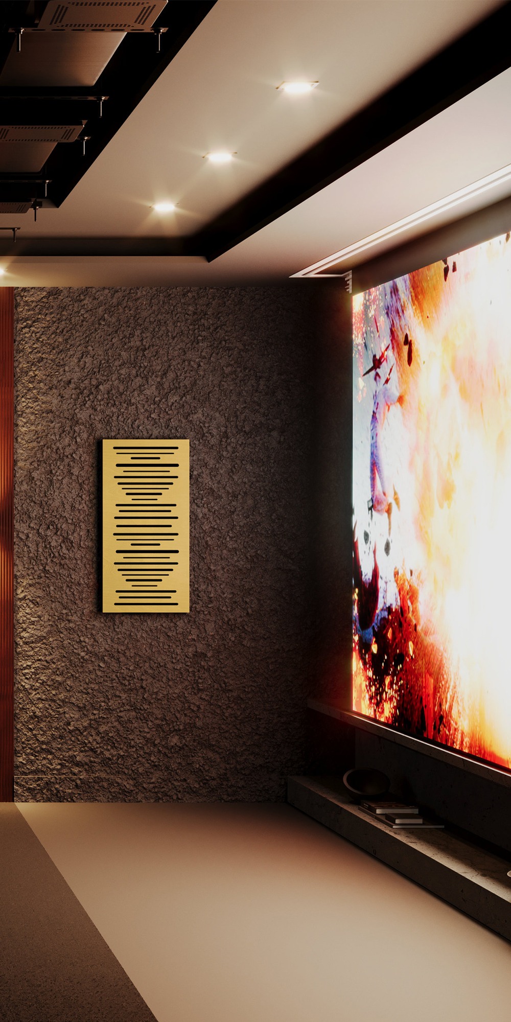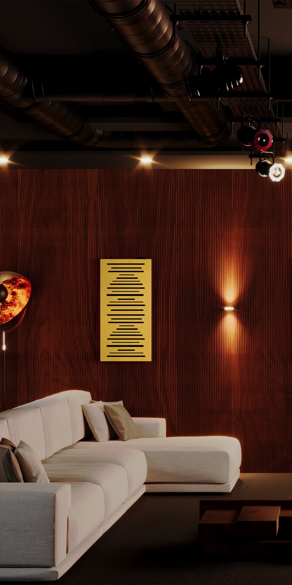 Los elementos acústicos híbridos son soluciones versátiles que combinan funciones de absorción y difusión del sonido en un solo elemento elegante. Presentan un frente de madera con patrones cortados con precisión que absorben el exceso de energía acústica y controlan las reflexiones en el espacio. Gracias a la combinación de madera natural con materiales fonoabsorbentes en la parte posterior, ofrecen un enfoque equilibrado para el tratamiento acústico. Su diseño atractivo los convierte en un elemento decorativo que se integra armoniosamente en interiores modernos como estudios, oficinas o espacios residenciales.