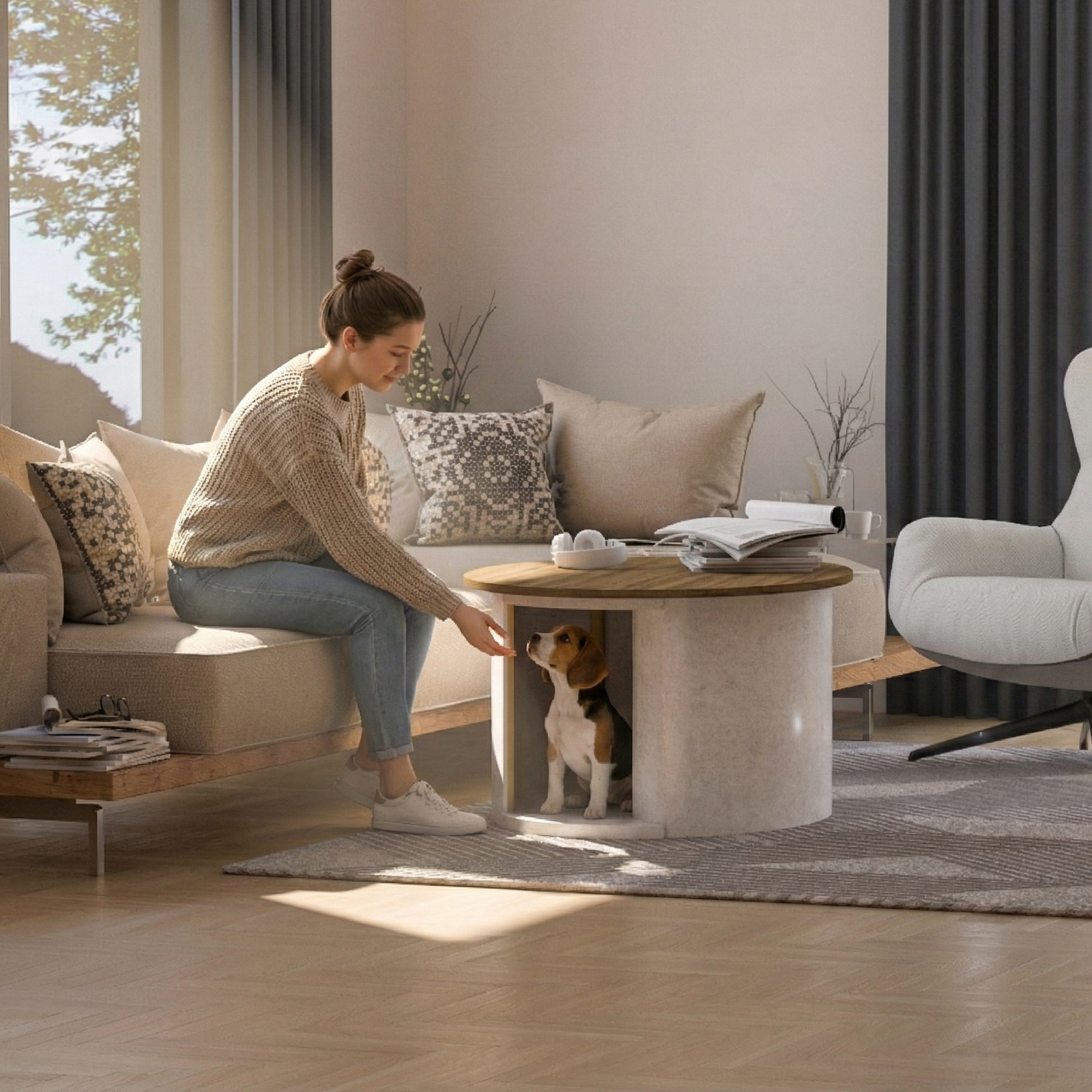 Mueble elegante que combina un refugio confortable para tu mascota con una mesa de café funcional de estilo moderno.