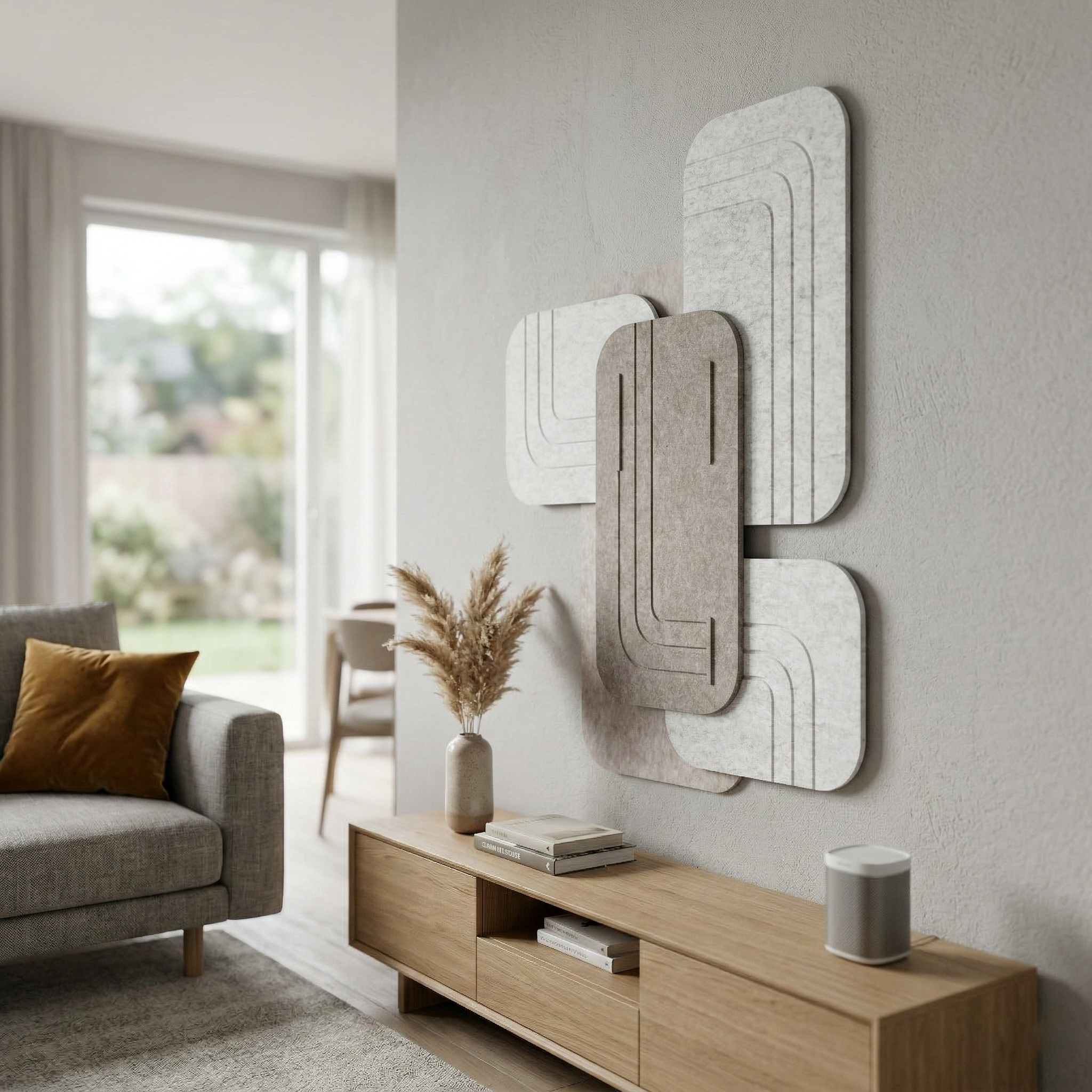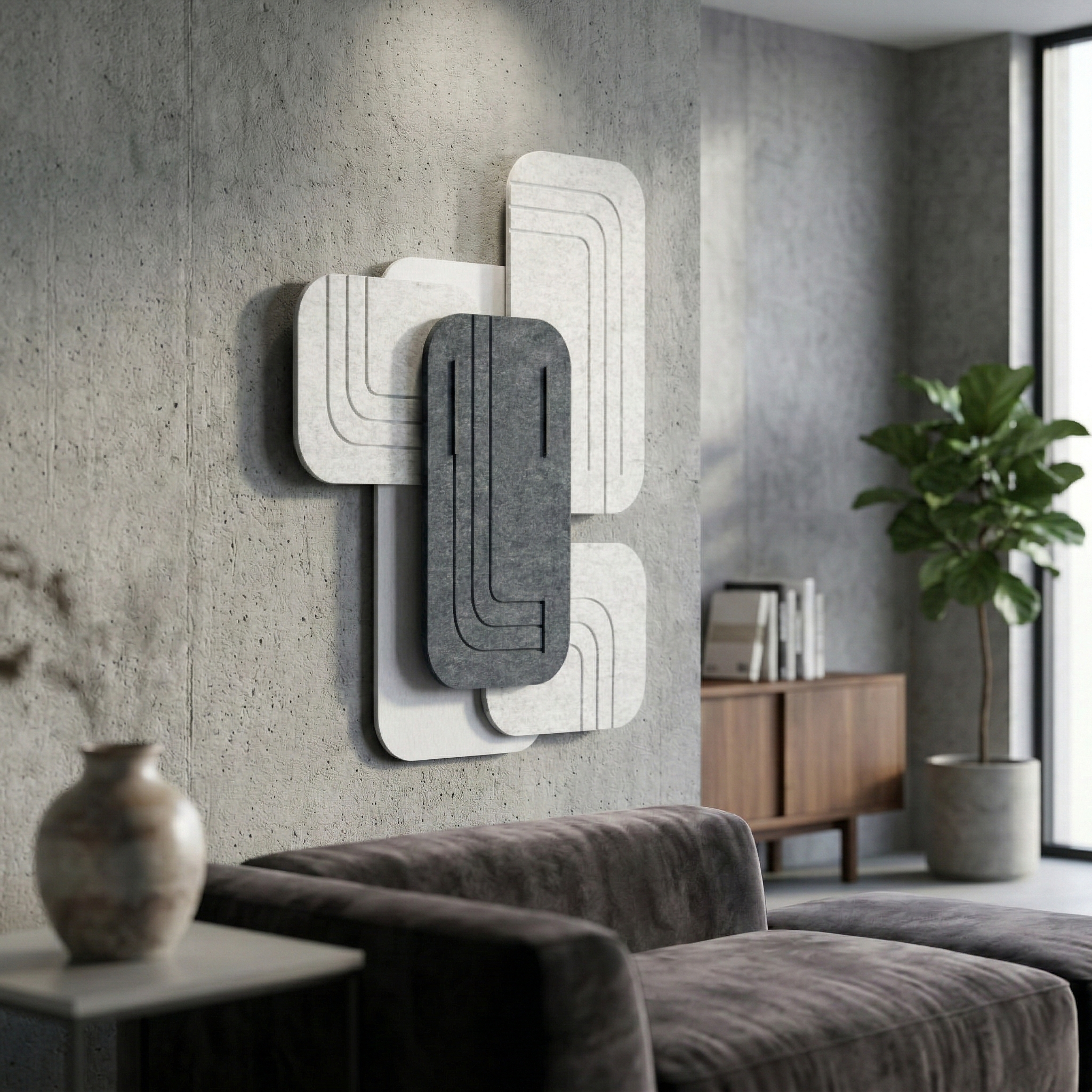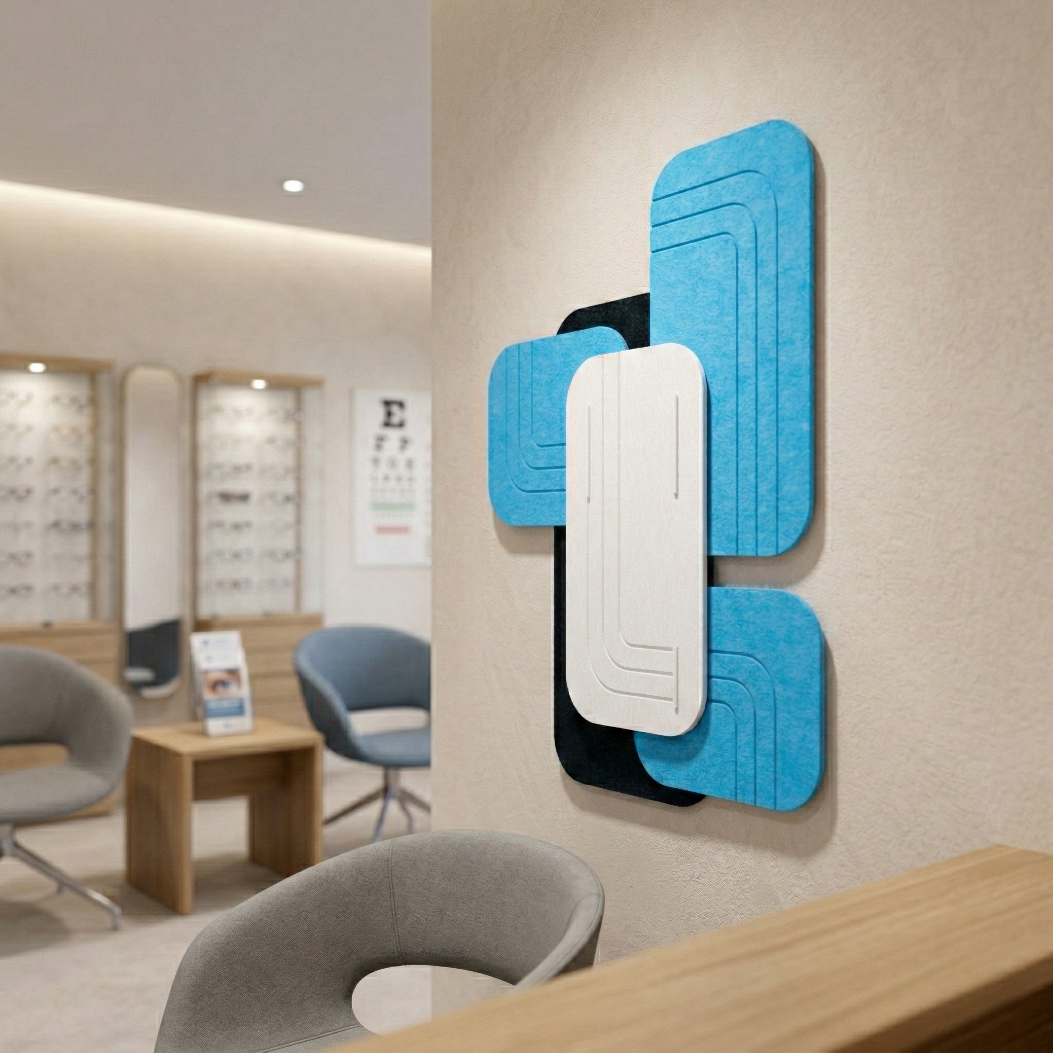 Una estructura tridimensional única de fieltro acústico crea un llamativo juego de luz y sombra en la pared. Los elementos geométricos aportan profundidad y carácter al interior, combinando función decorativa y acústica.
