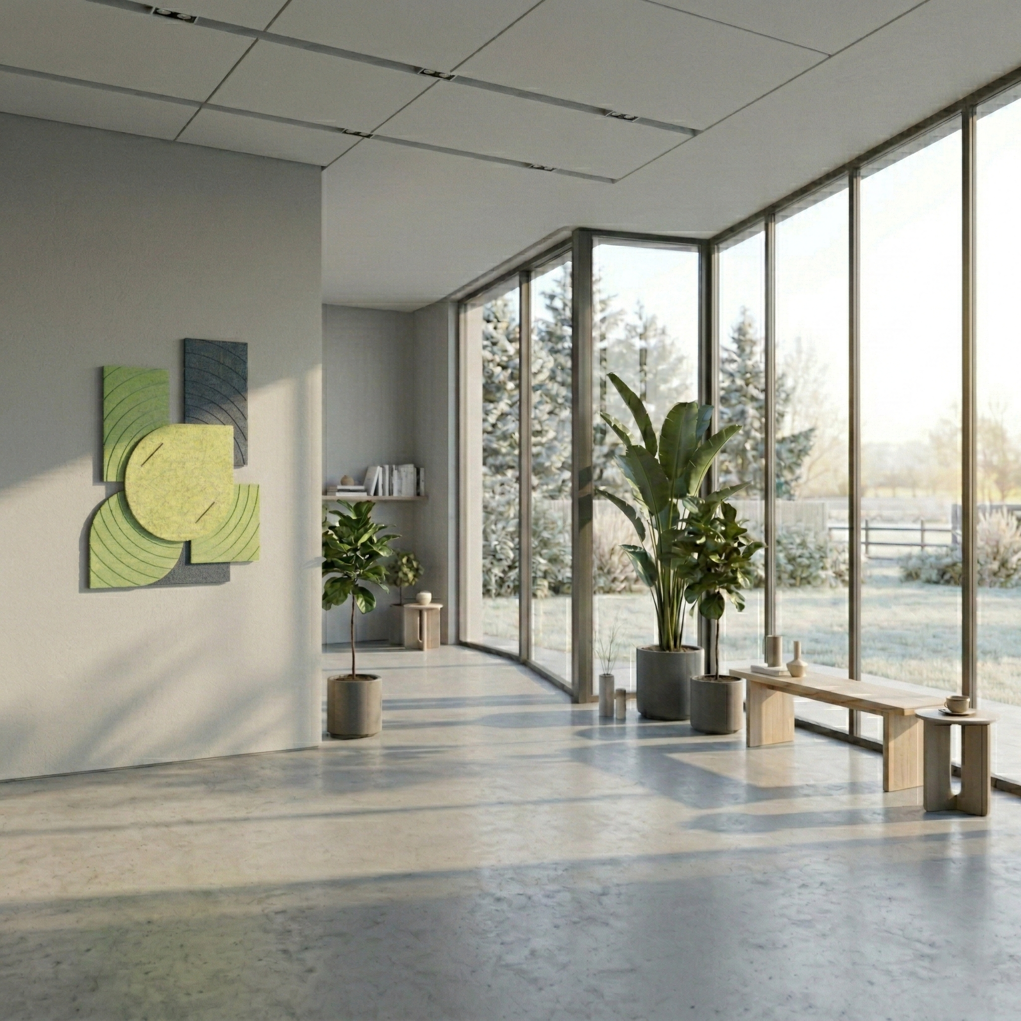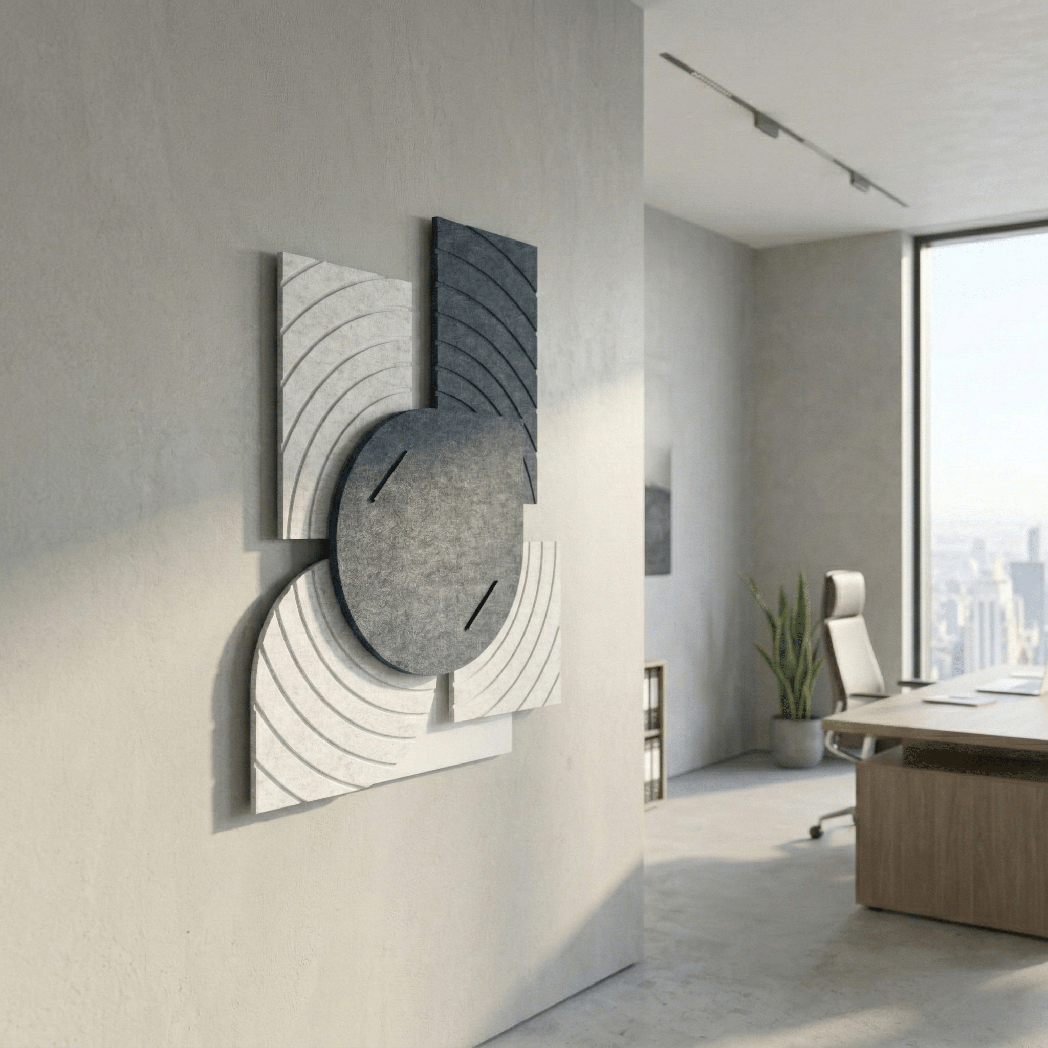 Una estructura tridimensional única de fieltro acústico crea un llamativo juego de luz y sombra en la pared. Los elementos geométricos aportan profundidad y carácter al interior, combinando función decorativa y acústica.