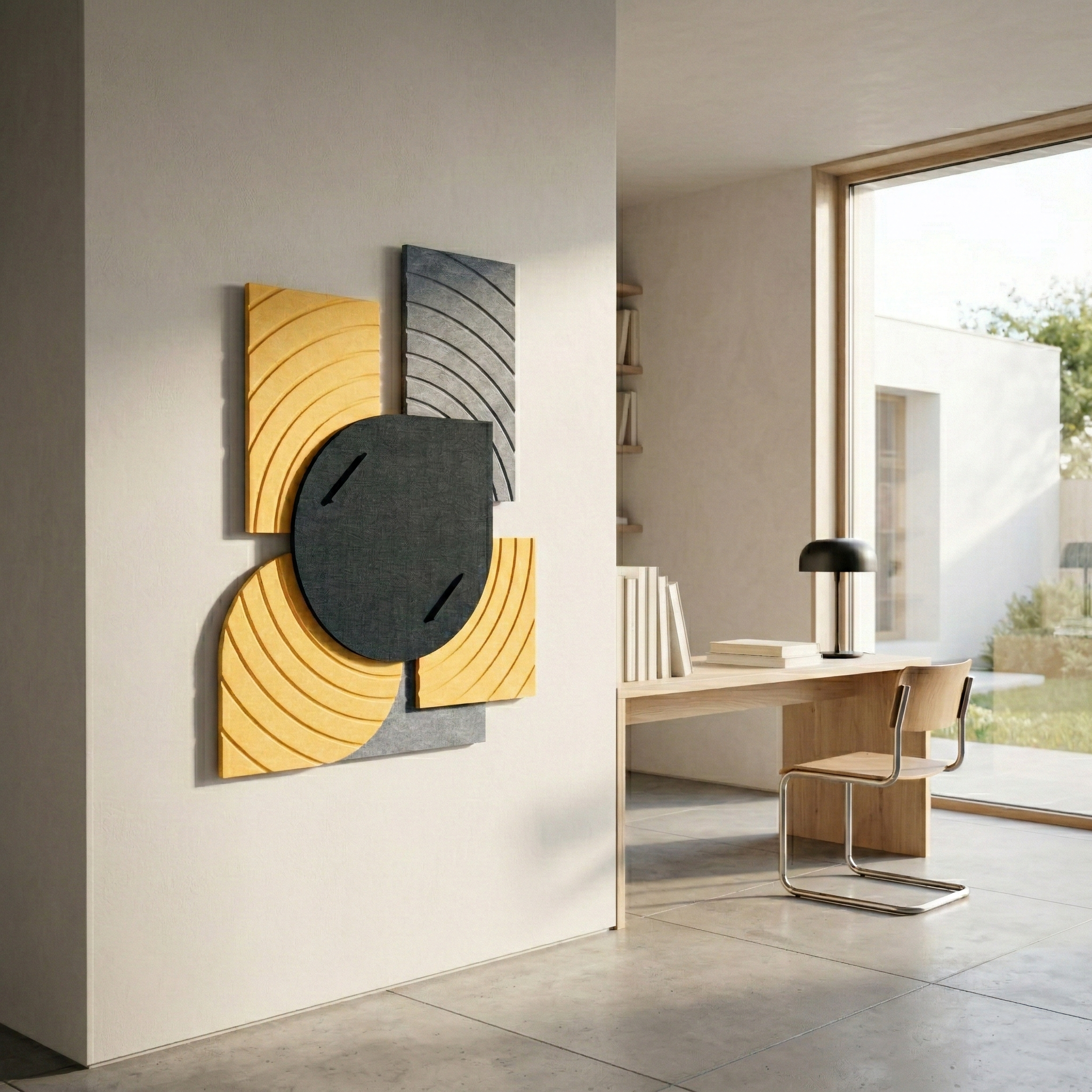 Resonance Orbit es un panel acústico decorativo fabricado con fieltro certificado Pro.Felt 9mm, que combina formas rectangulares y circulares en una composición armoniosa inspirada en las órbitas celestes. Reduce eficazmente la reverberación y el eco, creando una original e impactante instalación mural. El panel cuenta con tiras adhesivas aplicadas de fábrica e incluye tacos de montaje para una fijación reforzada. Siete variantes de color únicas se adaptan a cualquier estilo.